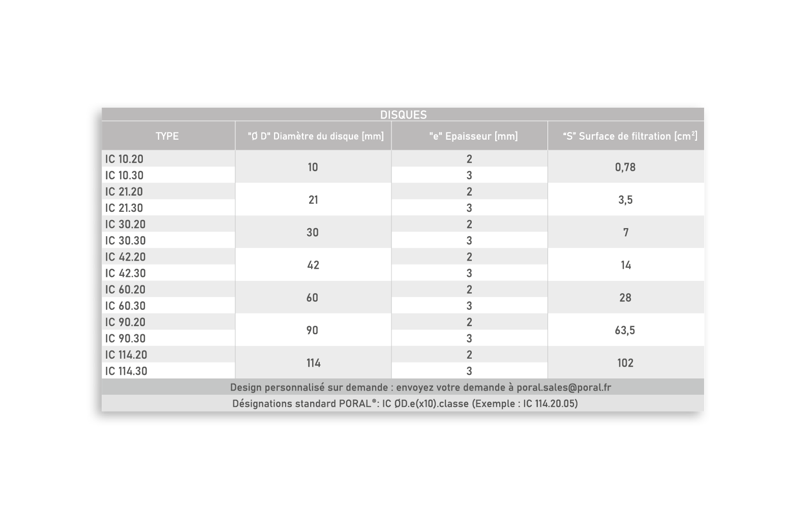 Pour les gaz, rétention à 98 % de particules solides de 0,2 μm (classe PORAL® 03) à 8 μm (classe PORAL® 40).