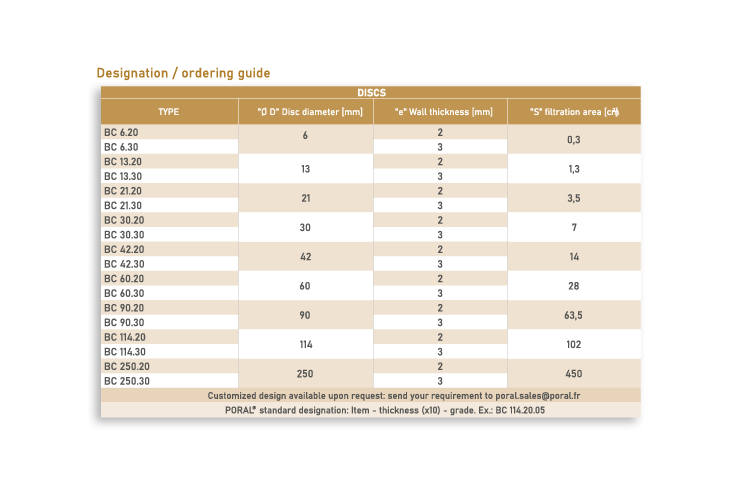 In liquids, retention at 98% of solid particles from 3,8 μm (PORAL® grade 03) to 190 μm (PORAL® grade 60).